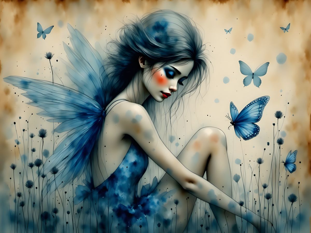 A breathtaking portrait of a young angelic woman sitting on a grassy knoll, surrounded by smoky mist, with vibrant blue skin, hair, and wings, set against a soft focus background.