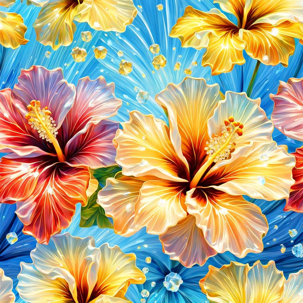 A striking picture of crystal hibiscus flowers with blue and yellow petals, rendered as vibrant digital art. The macro shot showcases delicate petal details and sparkling reflections in warm light.
