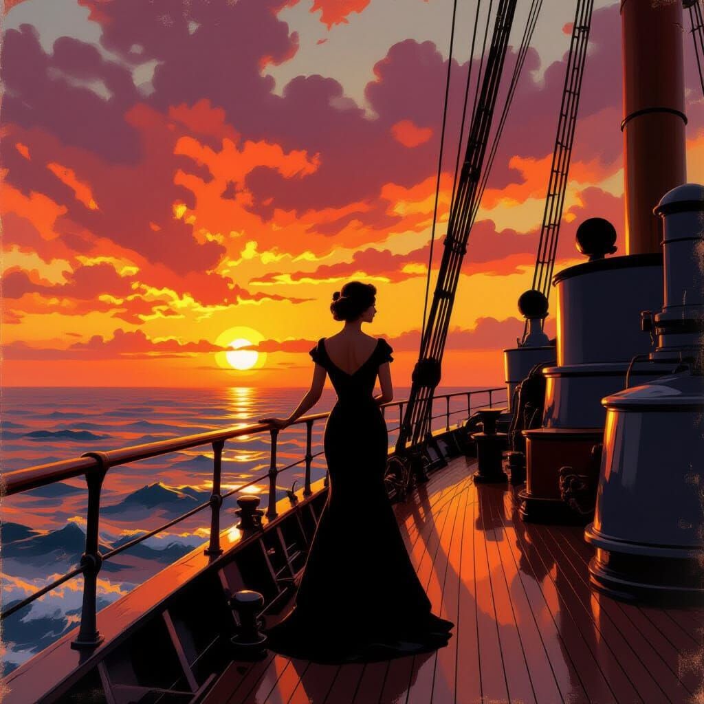 Generate your own vintage actress images on a grand warship at sunset. Free and easy AI image creation.