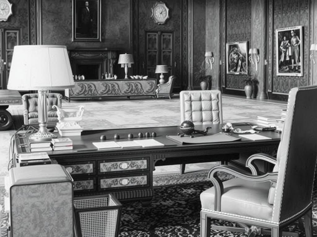 This stunning image depicts a detailed, cinematic recreation of a historic office in Berlin, inspired by a reference photo and evoking the feel of a high-end historical documentary with intricate, fantastical details and a rich, realistic color palette.