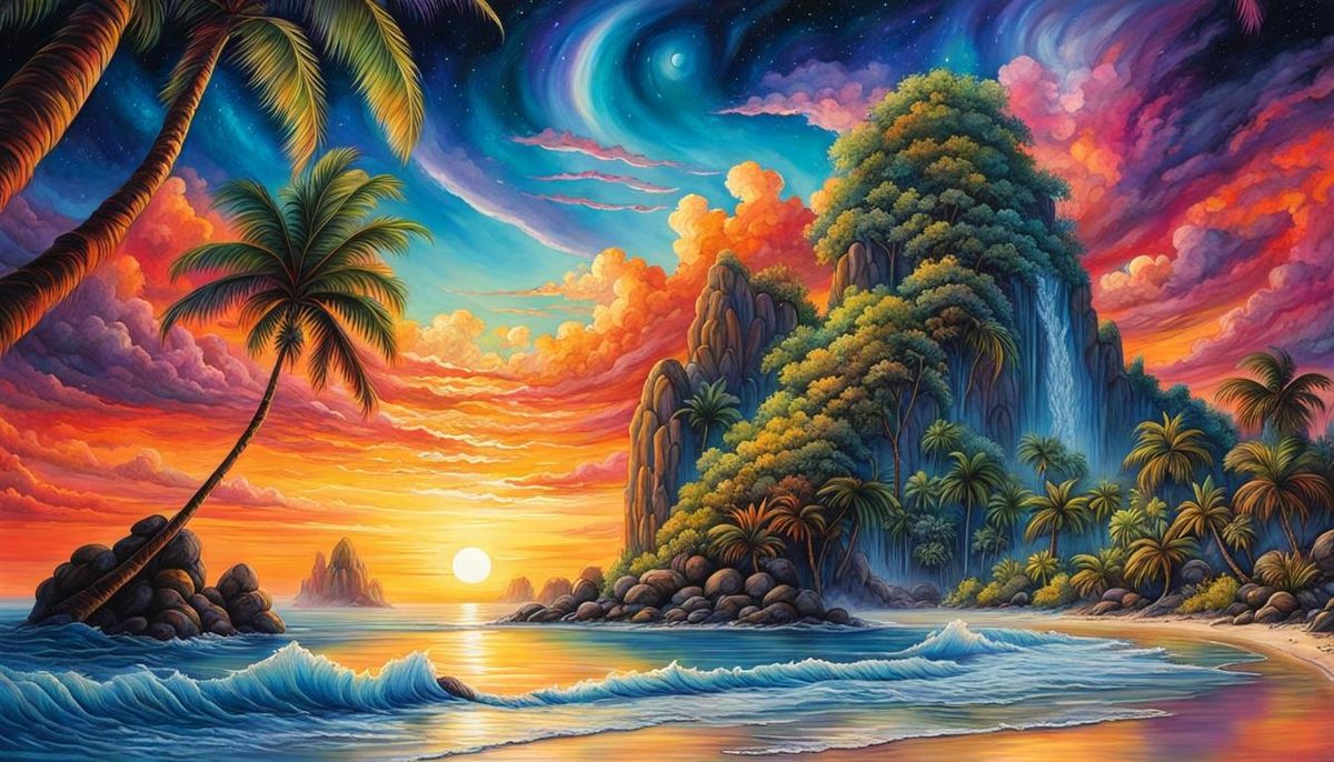 A vibrant seascape of a tropical island beach at sunset. The image shows a detailed line and watercolor aesthetic with colorful, melting textures and a cosmic galaxy arch.