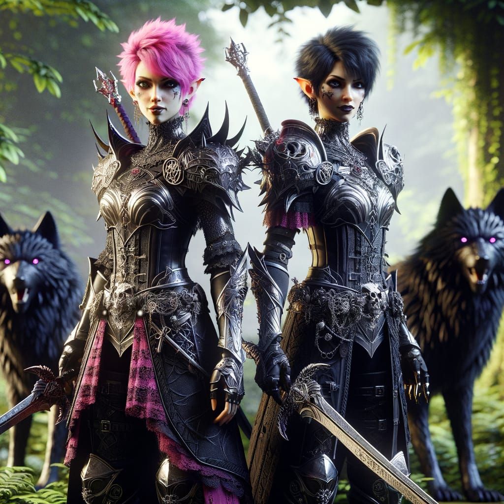 This image shows two gothic warrior women standing in a forest with their wolf companions. The women have neon pink hair and ornate armor, and they are armed with dual swords. A high resolution image.