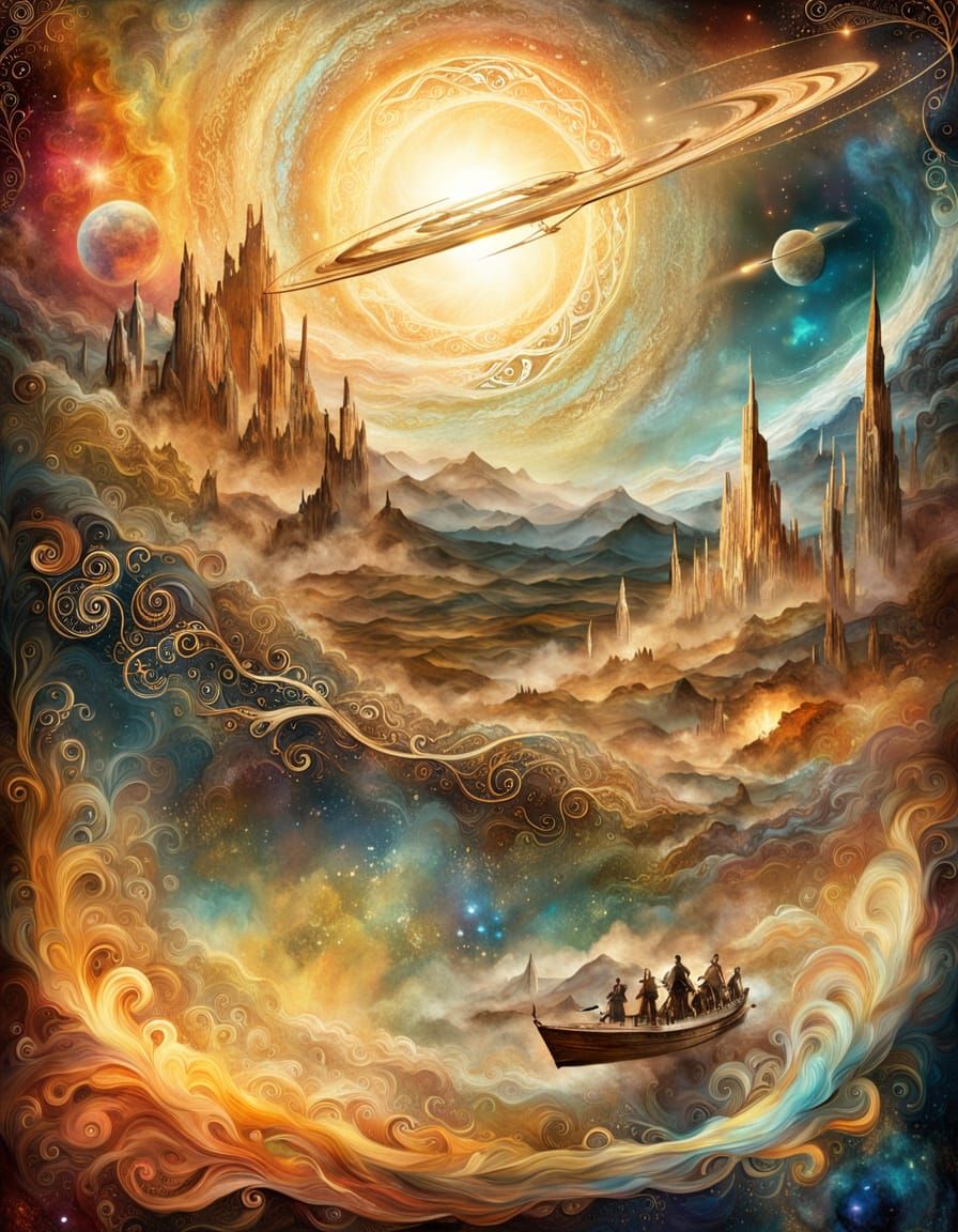 A collection of reimagined movie posters for The Lord of the Rings, featuring a futuristic battle scene in watercolor and a surreal dreamscape, rendered with rich texture and warm light.