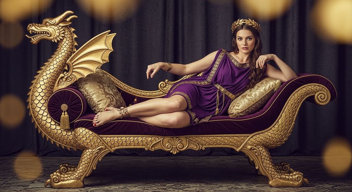 This image shows a Roman Empress reclining on a golden dragon-shaped chaise lounge. She wears a purple and gold toga and a golden crown. The image is a professional photograph with a soft bokeh.