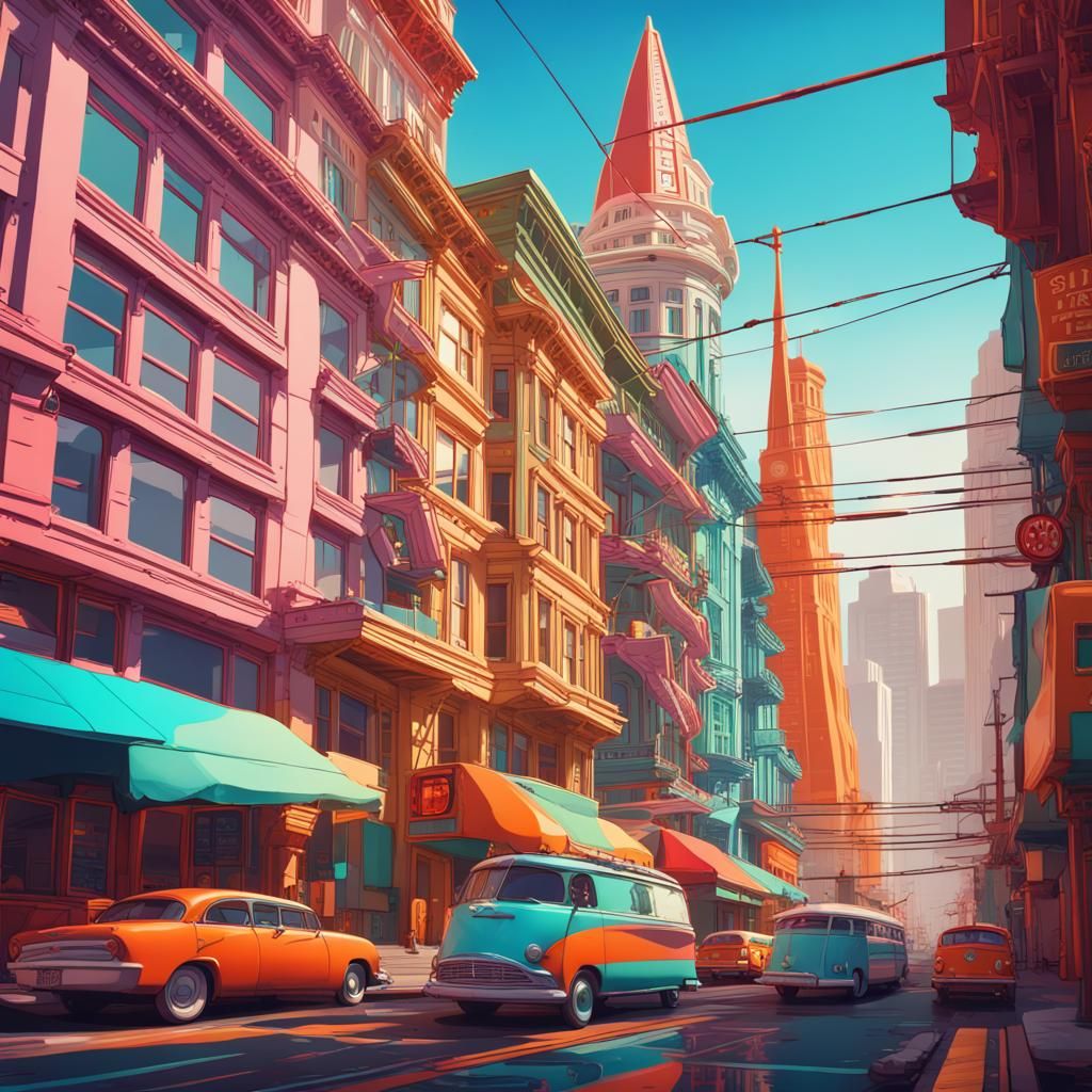 A vibrant image showcasing San Francisco landmarks in a constructivist art style. The artwork features deep colors and intricate details, resembling a fantasy concept art piece in 8k resolution.