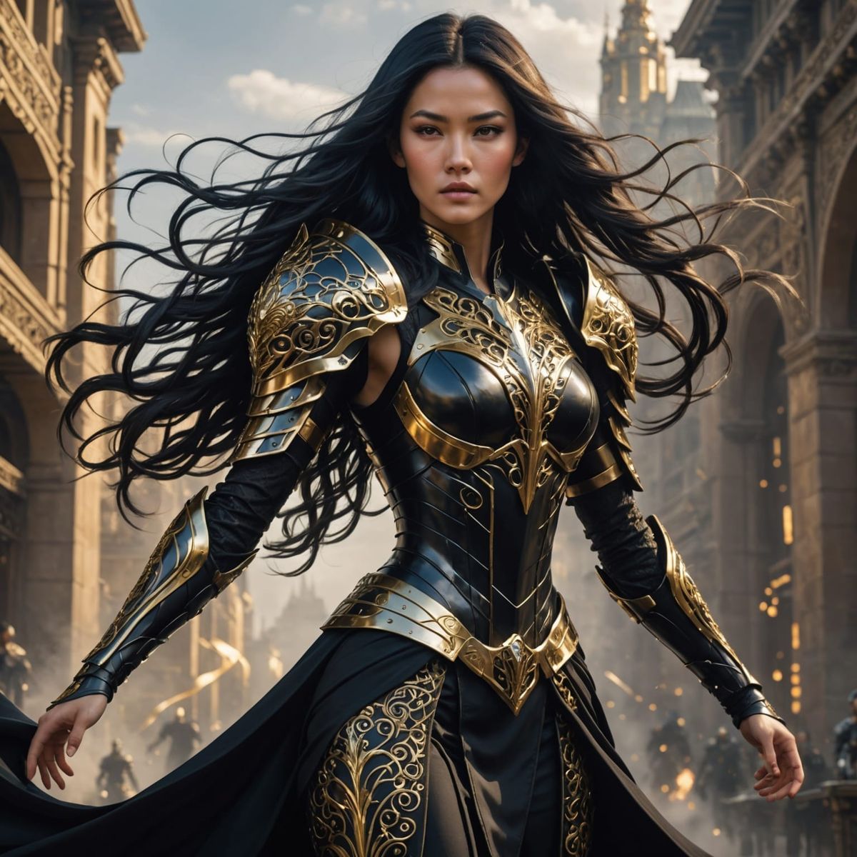 This image shows a futuristic warrior woman with long black hair in a cyberpunk aesthetic. She wears a form-fitting dress with golden circuit patterns, armored gauntlets, and stands in a glowing cityscape.