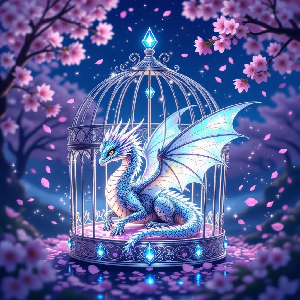 This image depicts an ornate silver birdcage filled with a radiant gem dragon, surrounded by blooming cherry blossoms under a magical night sky. Delicate light and drifting petals create an enchanted atmosphere.