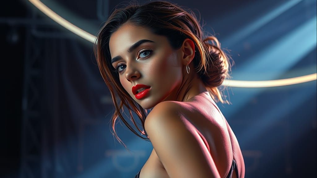 This image shows a woman with skin that appears to be polished marble, posed to highlight her body's contours. Dramatic lighting swirls around her in a cinematic style.