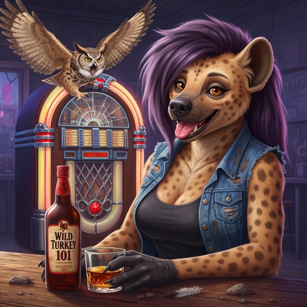 This image shows a spotted hyena in a torn denim vest enjoying whiskey at a bar, while a great-horned owl attacks a retro jukebox in the background. Rendered with vibrant colors and chiaroscuro.