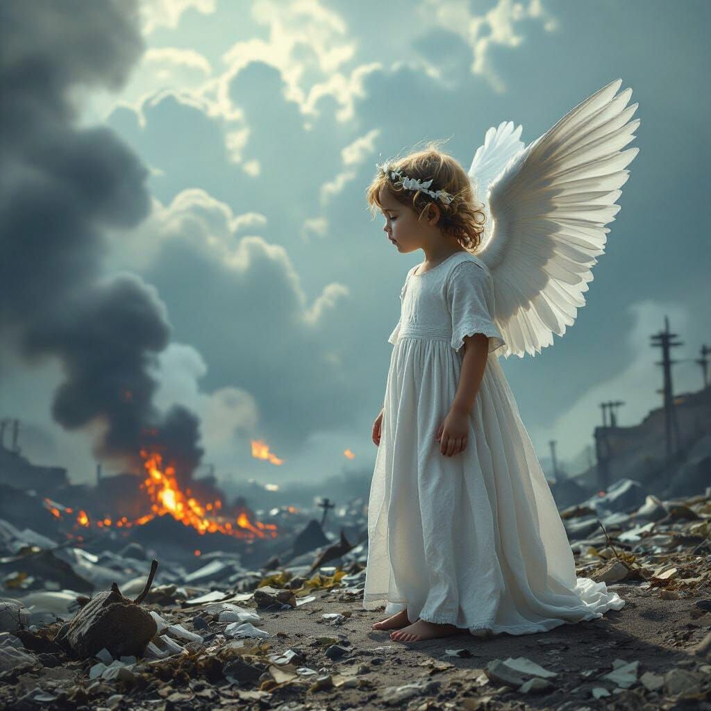 This image depicts a polluted earth with a baby angel descending from the heavens in dismay. The artwork evokes a dystopian, environmentally critical theme rendered in a dark, surreal style.