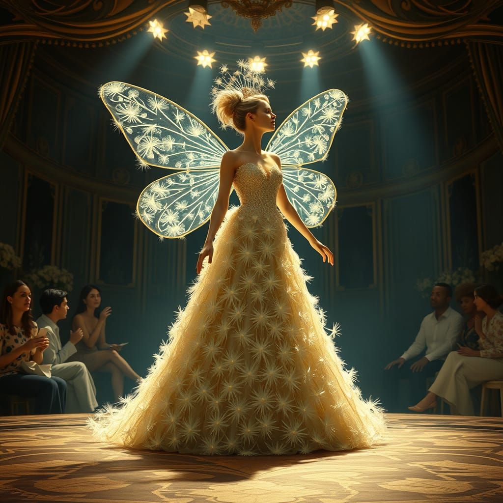 This enchanting image captures a fairy queen showcasing her exquisite, seed-embroidered gown on a majestic stage, surrounded by whimsical floral patterns and a soft, magical glow.
