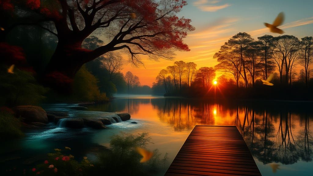 Hyper-realistic bioluminescent double exposure of rivers, forests, sunsets, blossoms, and nature inside, combined with a complex and intricate double exposure of a transparent fisherman standing on a deck, casting a line into the water, music-like motion trails in the air :: White background :: Sunset+Trees+Memories ...