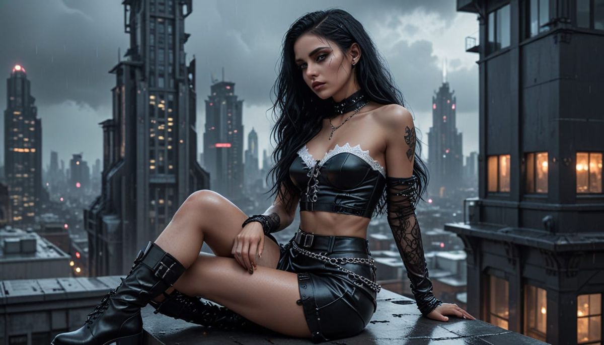 This image shows a young woman with striking features in a cyberpunk aesthetic. She is posed on a rooftop overlooking a futuristic city, enhanced with gothic and hyperrealistic elements.