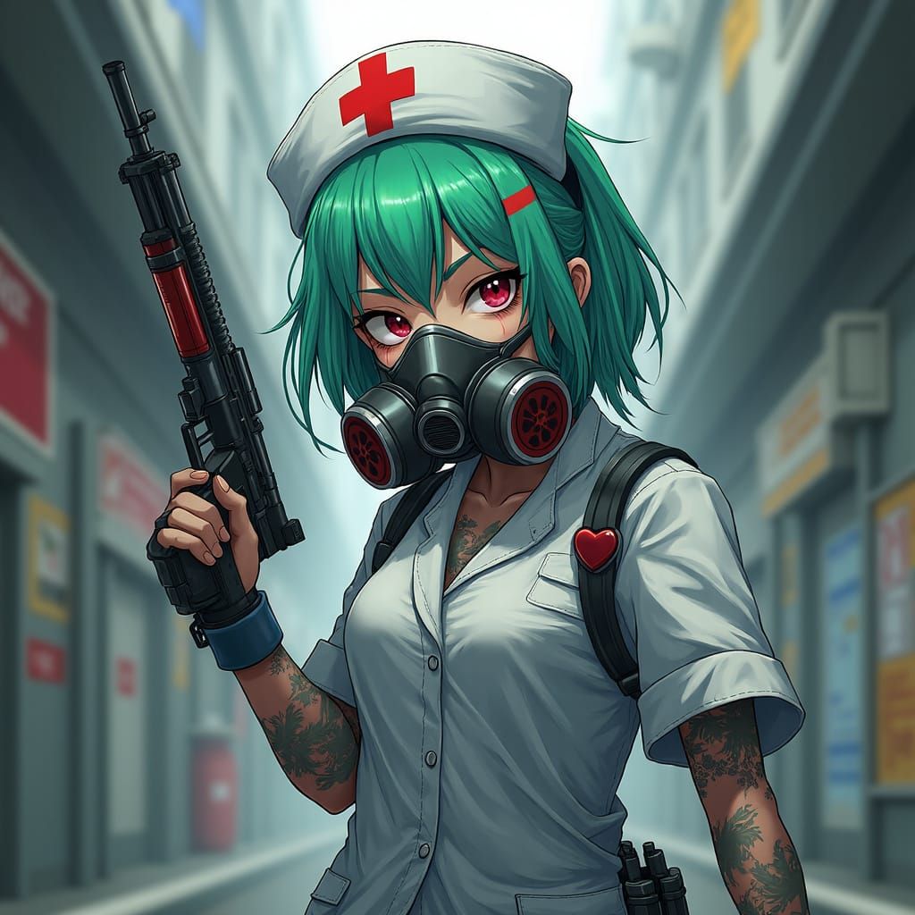 This hyper-realistic fantasy art depicts an anime zombie nurse with green and blue hair, holding a machine gun. The detailed illustration features a gas mask and vibrant colors against an urban backdrop.
