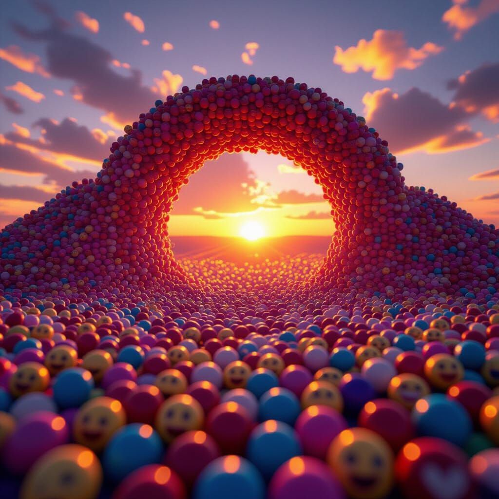 This image features a 3D sunset scene composed entirely of colorful emojis in royal shades. The sun glows softly through the dense emoji crowd, creating a magical atmosphere with cinematic rendering.
