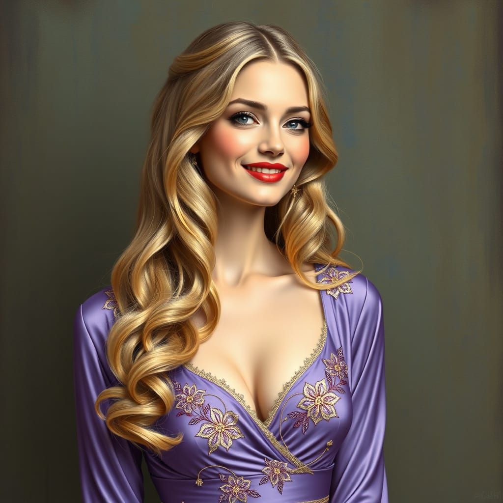 This image depicts a classically beautiful European woman with long, wavy blonde hair and a sophisticated smile, wearing a light violet silk gown in a refined Art Nouveau style, reminiscent of pre-Raphaelite oil paintings with intricate details and luminous depth.