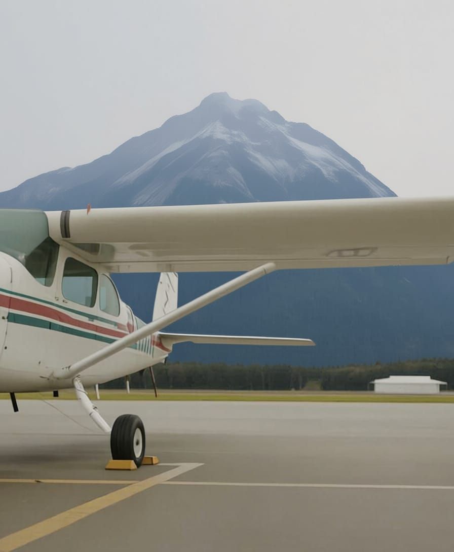 This image shows a woman holding an urn and standing in front of an airport check-in trailer. The photo is in the style of Wes Anderson with cinematic lighting and film grain.