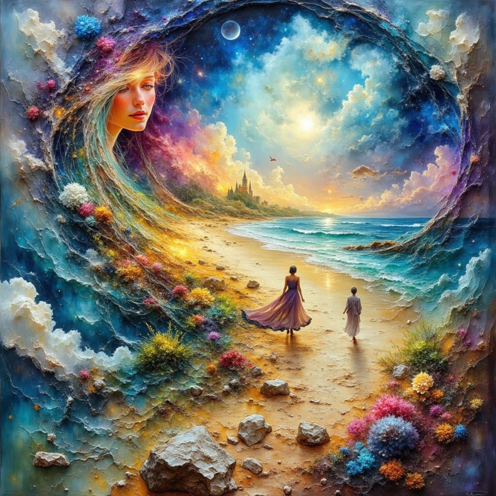 A vibrant and surreal oil painting featuring a woman standing before a dreamlike landscape. The artwork showcases colorful pastel tones, textured impasto layers, and crepuscular rays, creating a glossy, tactile feel.