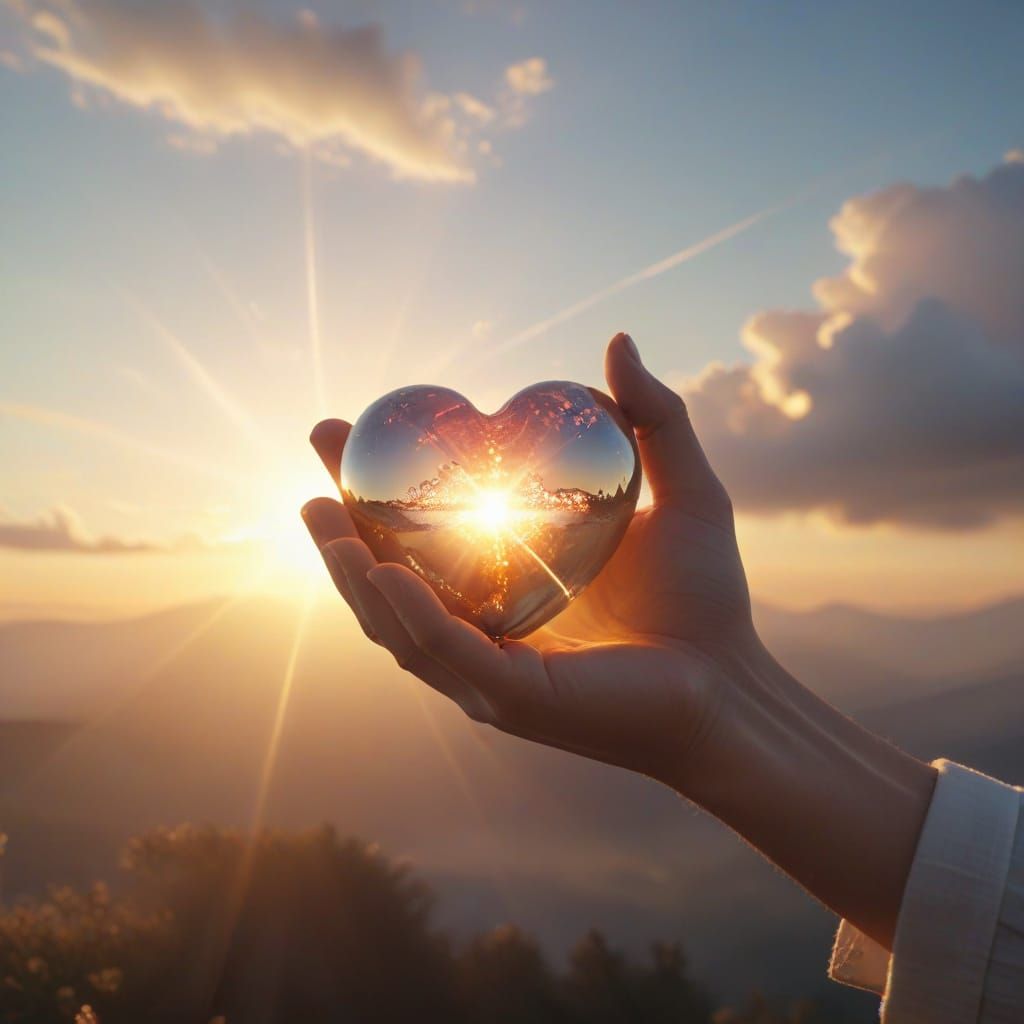 This image shows a person holding a heart in a cinematic style. Warm light and pastel colors combine to create a peaceful atmosphere with a heavenly glow.
