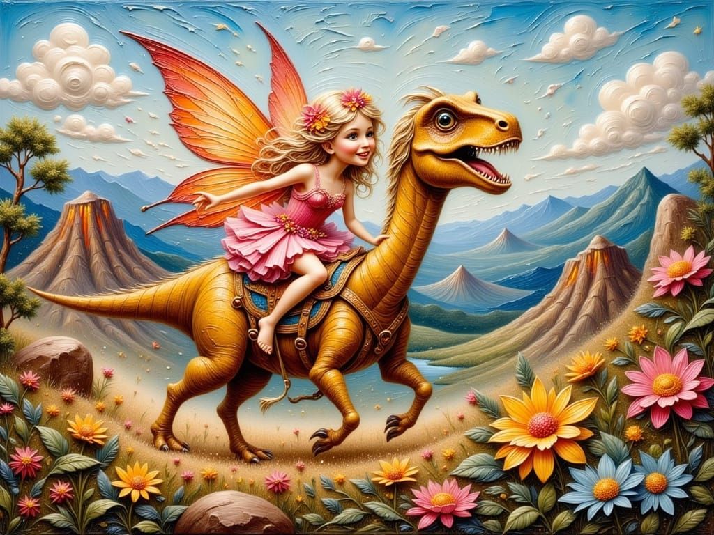 A whimsical painting in a post-impressionist style depicting a fairy riding a dinosaur through a volcanic landscape. The artwork features bold brush strokes and impasto techniques, creating a textured and fanciful scene.