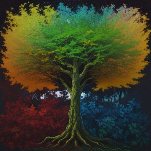 A vibrant digital painting of a tree depicting five stages of growth through roots, vines, and leaves. The artwork features golden hour lighting, twinkling leaves and shining roots, rendered in abstract expressionism with surreal and symbolic elements.