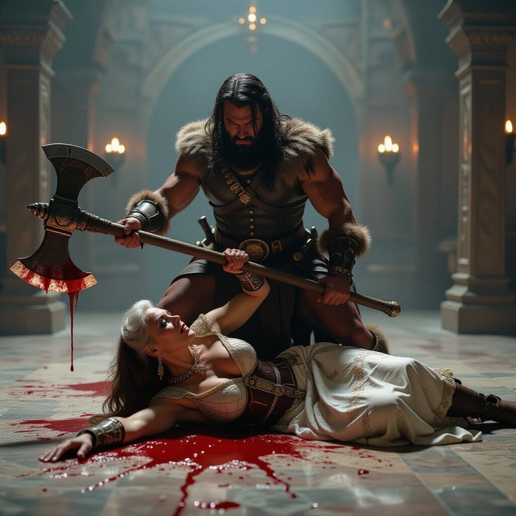 A dramatic scene depicts a fallen duchess in opulent clothing reaching for her back, with a barbarian standing over her holding a great axe. The image has a cinematic aesthetic.