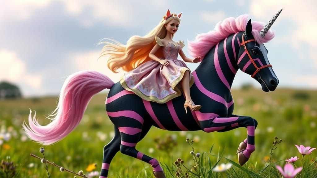 This image shows a whimsical, dreamlike scene of a beautiful woman riding a galloping unicorn in a bright, colorful meadow. The unicorn's mane is fluffy and textured, and its horn is intricately detailed with glittering sparkles.