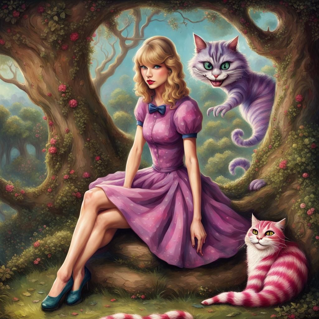 This image shows the singer Taylor Swift rendered as the Cheshire Cat. The image captures a whimsical and surreal blending of celebrity and fantasy.