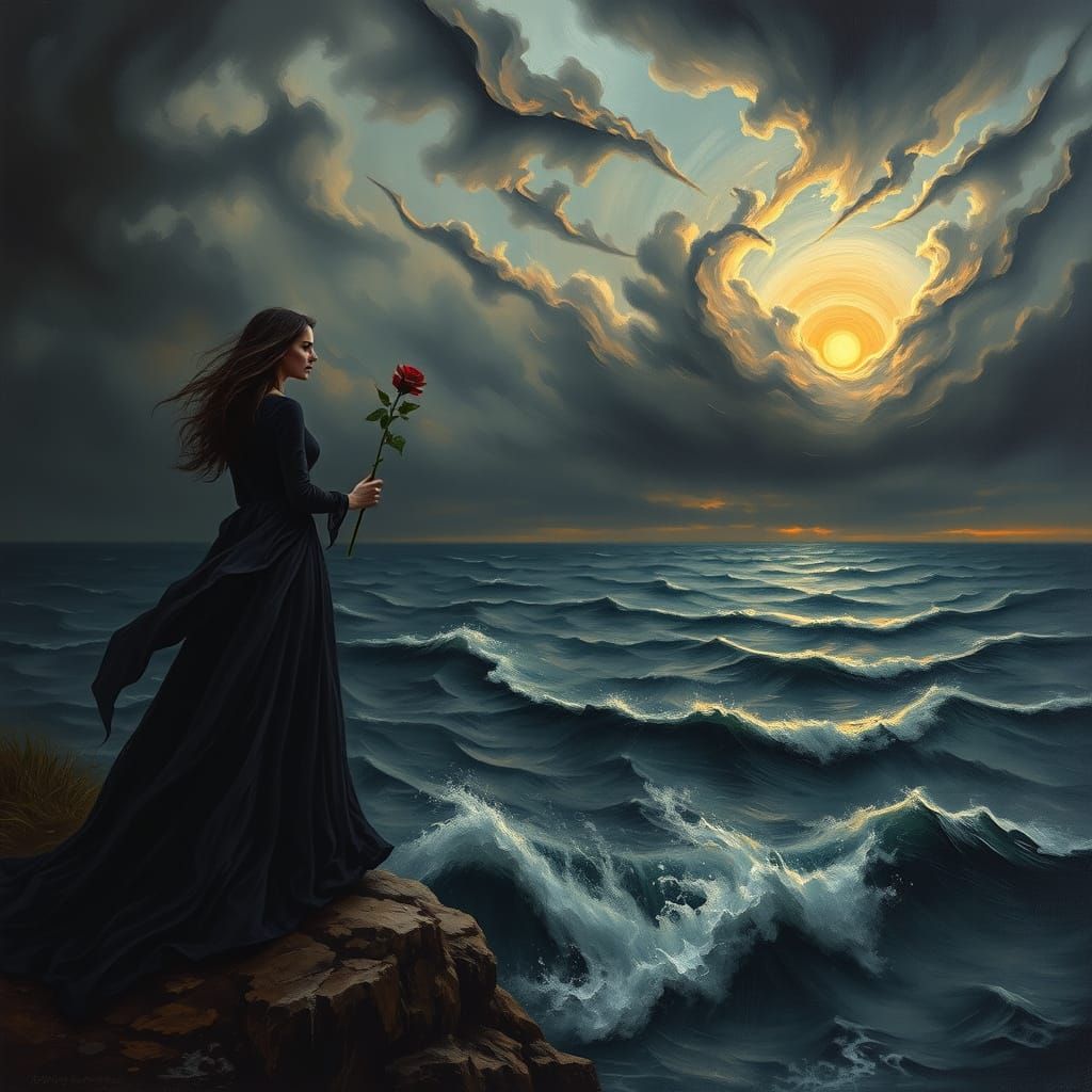 This image shows a solitary gothic woman on a cliff, holding a wilting rose against a stormy sea and dramatic sky. Rendered in a painterly, impasto style with chiaroscuro lighting.