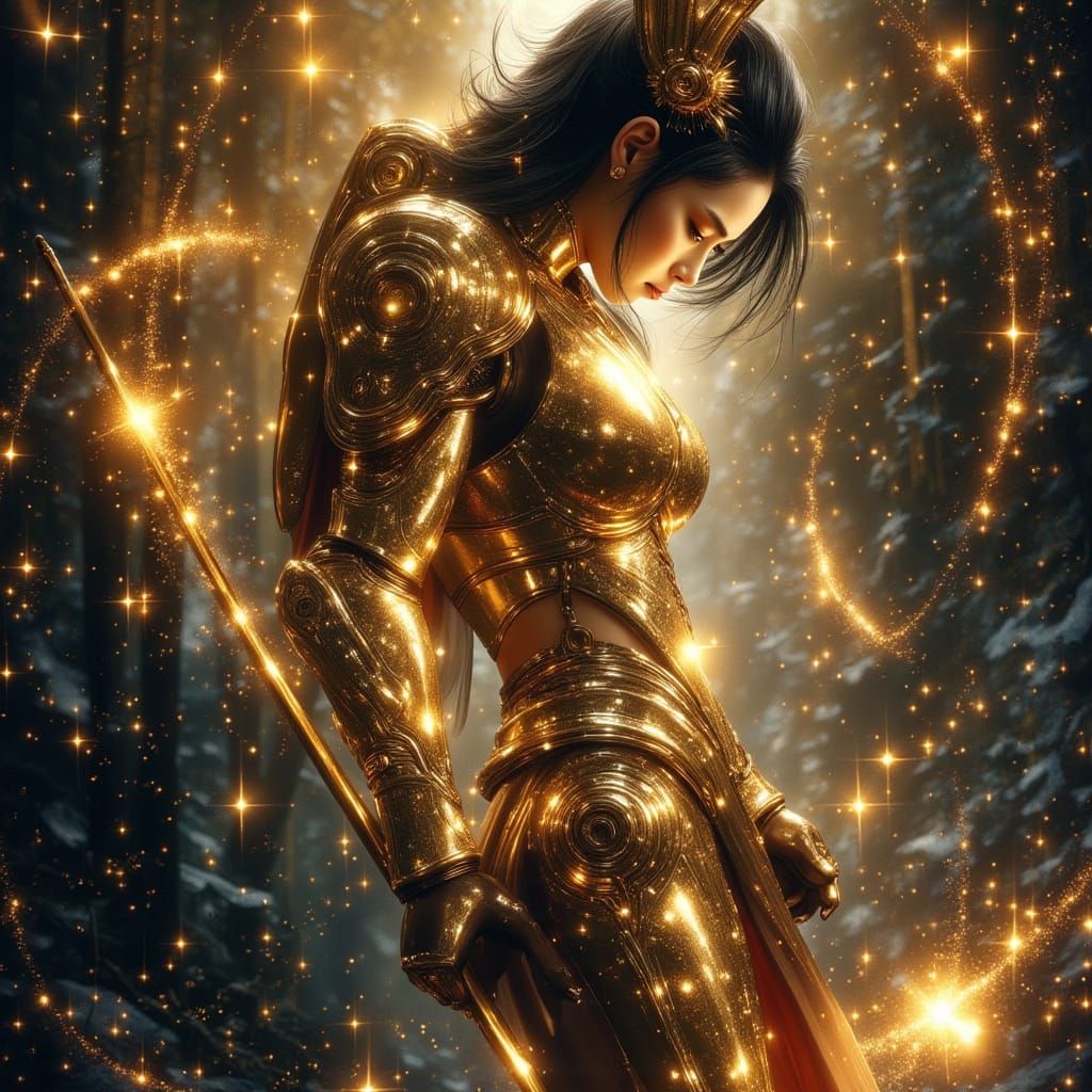 This image shows a stunning sci-fi artwork featuring a futuristic geisha in a dynamic battle pose, surrounded by a vibrant cosmic scene with intricate armor and hyperrealistic details.