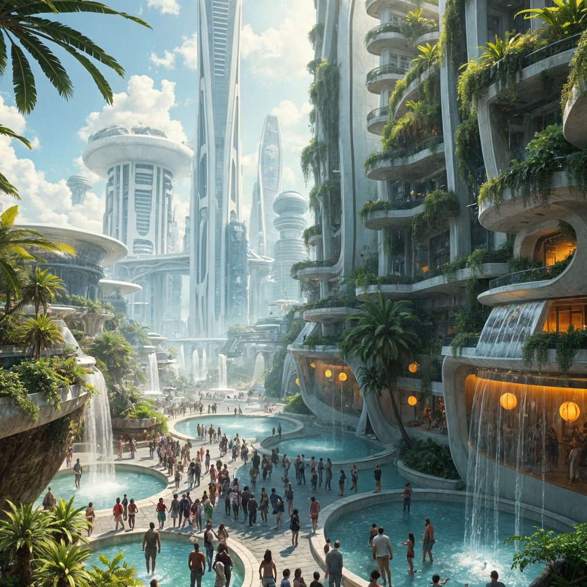This image shows a vibrant, futuristic city square filled with lush vegetation and water features. The scene is characterized by white, solarpunk-styled buildings and a thriving community.