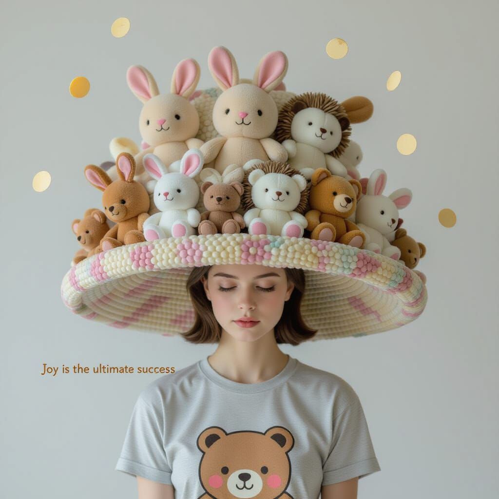 This image shows a surreal portrait of an oversized hat made from kawaii plush toys. A young woman wears the hat against a minimalist background with cinematic lighting.