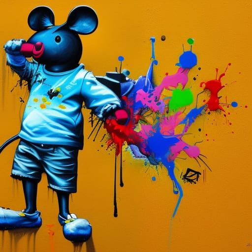 A vibrant graffiti-style image of a mouse. The artwork features a colorful and highly detailed aesthetic, reminiscent of street art with acrylic and gouache elements.
