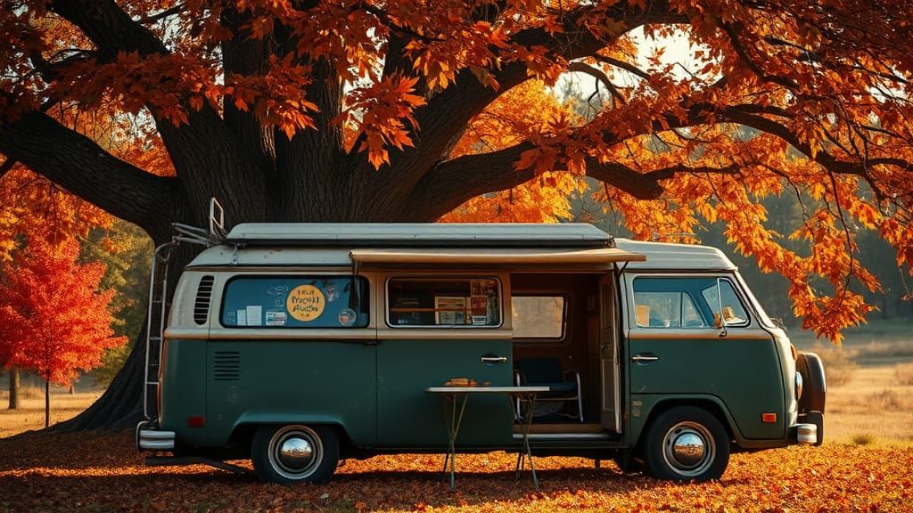 This image shows a faded dark green Volkswagen RV parked under a towering oak tree in autumn. The scene is bathed in warm sunlight, with leaves swirling around the vintage van.