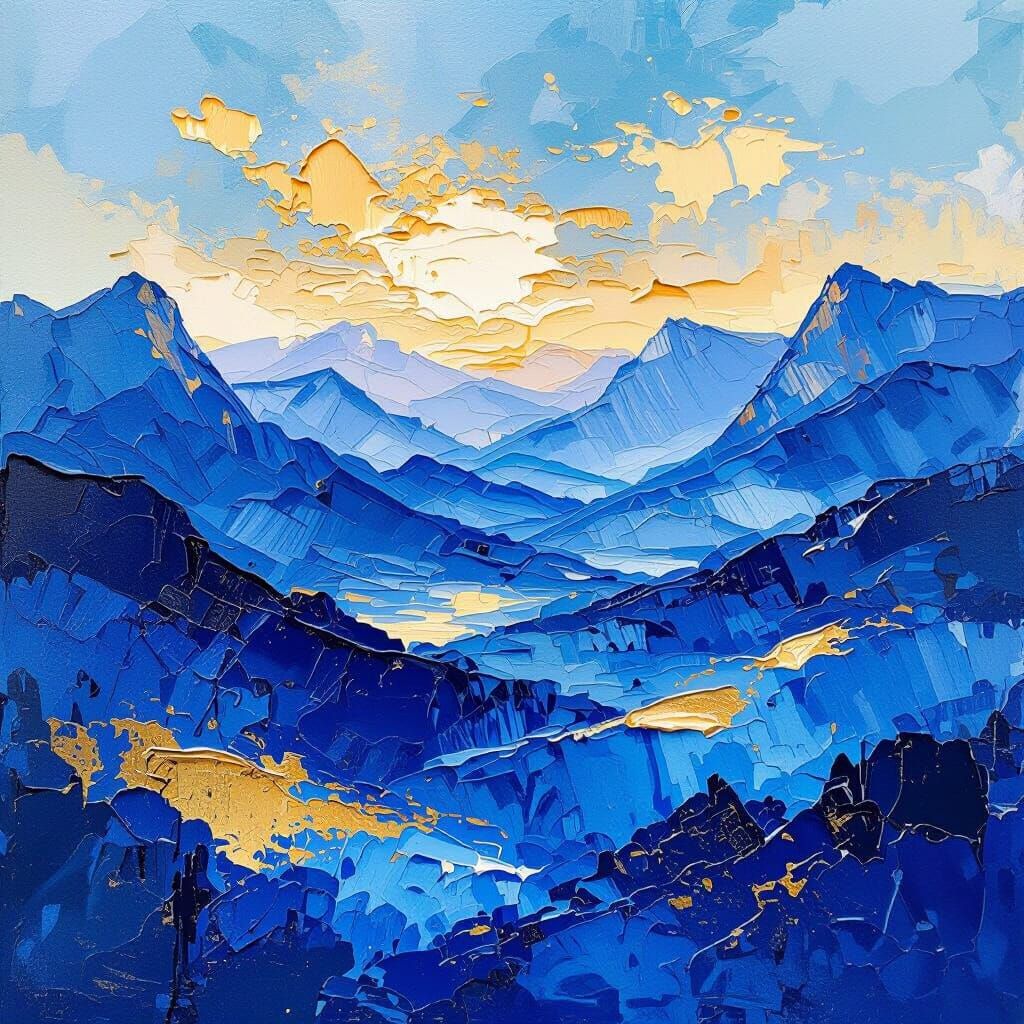 This image showcases a grand, textured landscape in blue and gold, created with thick, layered gouache brushstrokes. Rendered in a maximalist impressionist style, it features rich detail and tactile qualities.