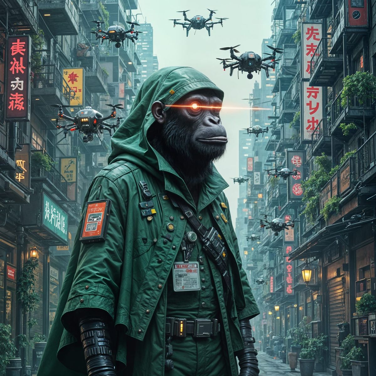 This image shows a BAYC-inspired ape, a connected and eccentric urban druid, commanding messenger drones. It wears a unique cloak made of metro tickets and data-chips.