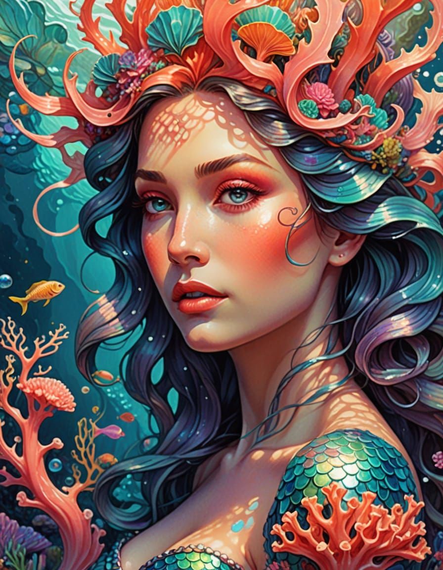 This enchanting image is a mesmerizing blend of a serene mermaid's face and a vibrant coral reef, with shimmering iridescent scales and rainbow-colored coral swirls, evoking a dreamlike, surreal quality reminiscent of vintage botanical illustrations.