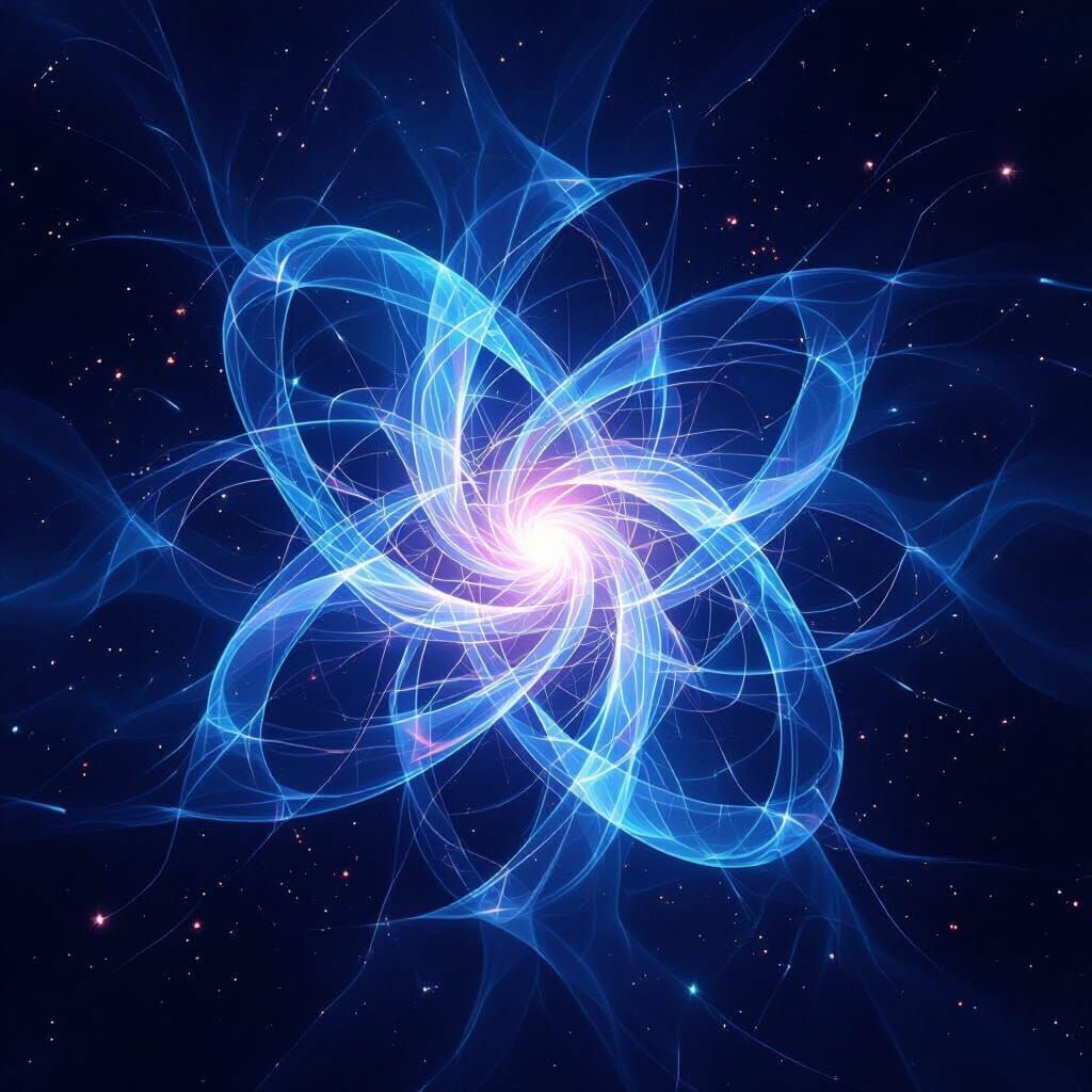 This image showcases abstract, glowing light forms symbolizing rebirth against a dark, cosmic background. It features an electronic vibe with luminous gradients and fractal details, rendered in a digital painting style with neon accents.