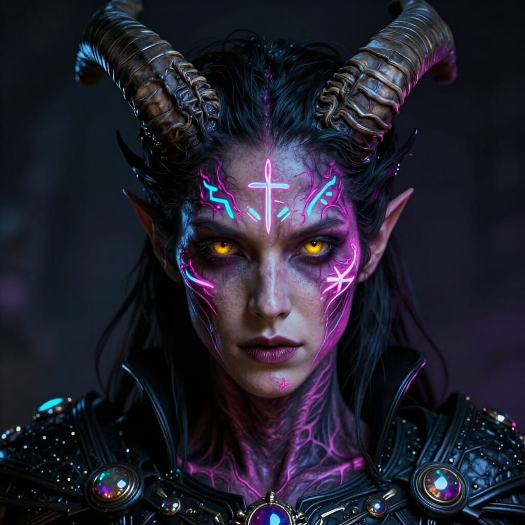 Hyperrealistic depiction of a demonic human hybrid tarot figure with glowing magenta and cyan rune markings and an intense gaze. Digital matte painting with cinematic lighting.