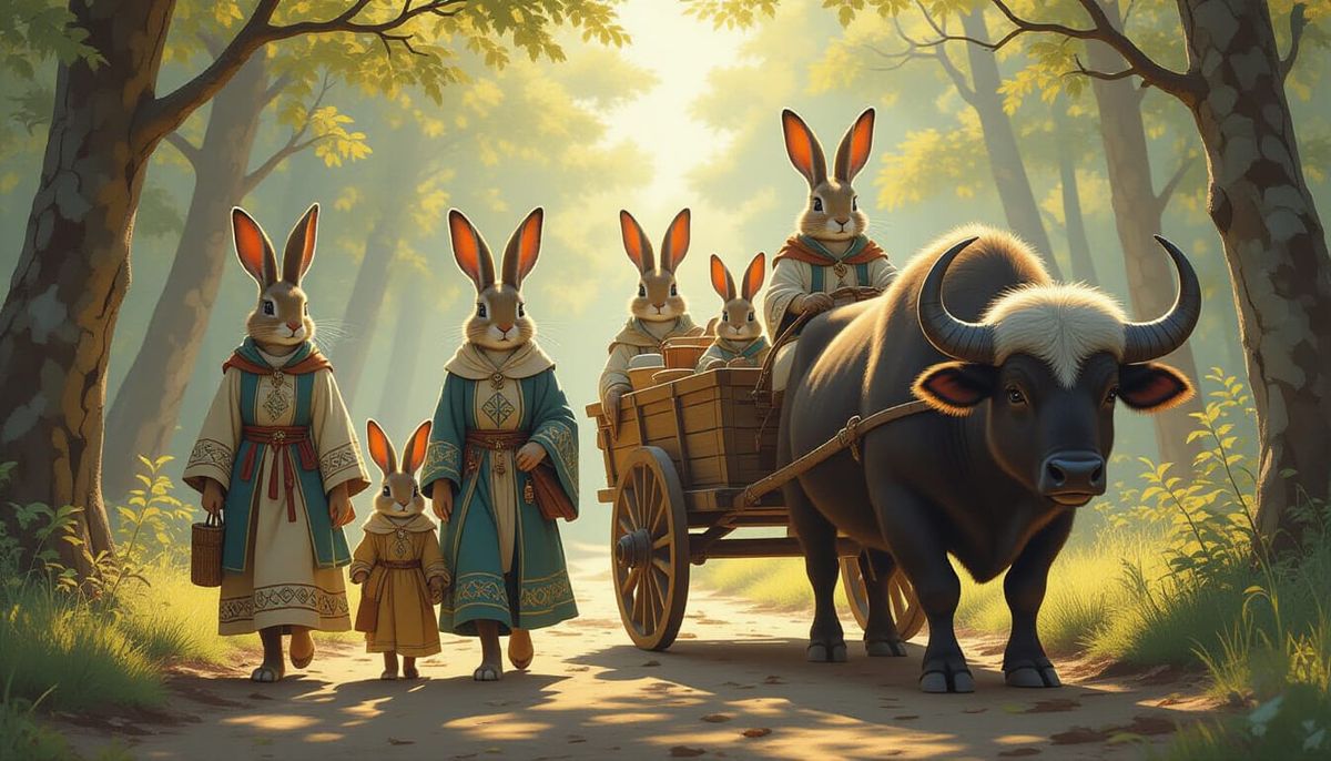 A family of five hare-like humanoids travels through a sunlit forest. The parents walk alongside a wooden wagon driven by one child, while two younger children sit amongst their belongings in this whimsical scene.