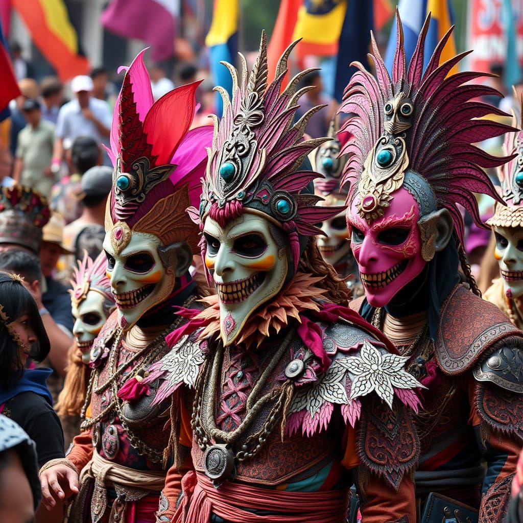 This image captures a lively festival with people in stunning, detailed masks and costumes. The art style blends fantasy and realism with bold colors and dynamic textures.