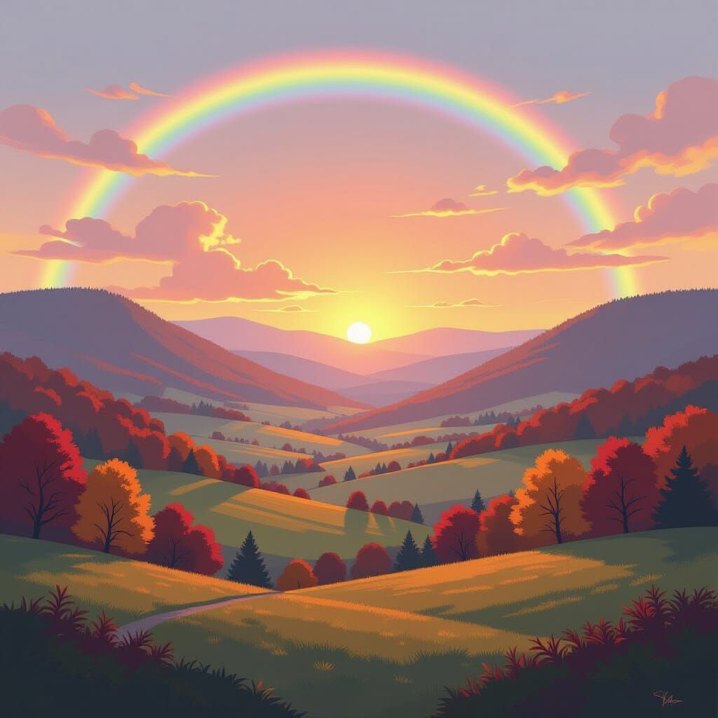 A serene valley landscape at dusk is bathed in warm light with vibrant fall foliage. A faint rainbow fades into soft pastel hues in this image with a whimsical, dreamy aesthetic.