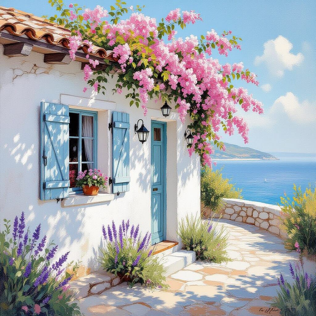 A picturesque coastal cottage basks in sunlight, with whitewashed walls and climbing vines. This impasto-style image evokes a shabby chic aesthetic with soft whites, pinks, greens, and blues.
