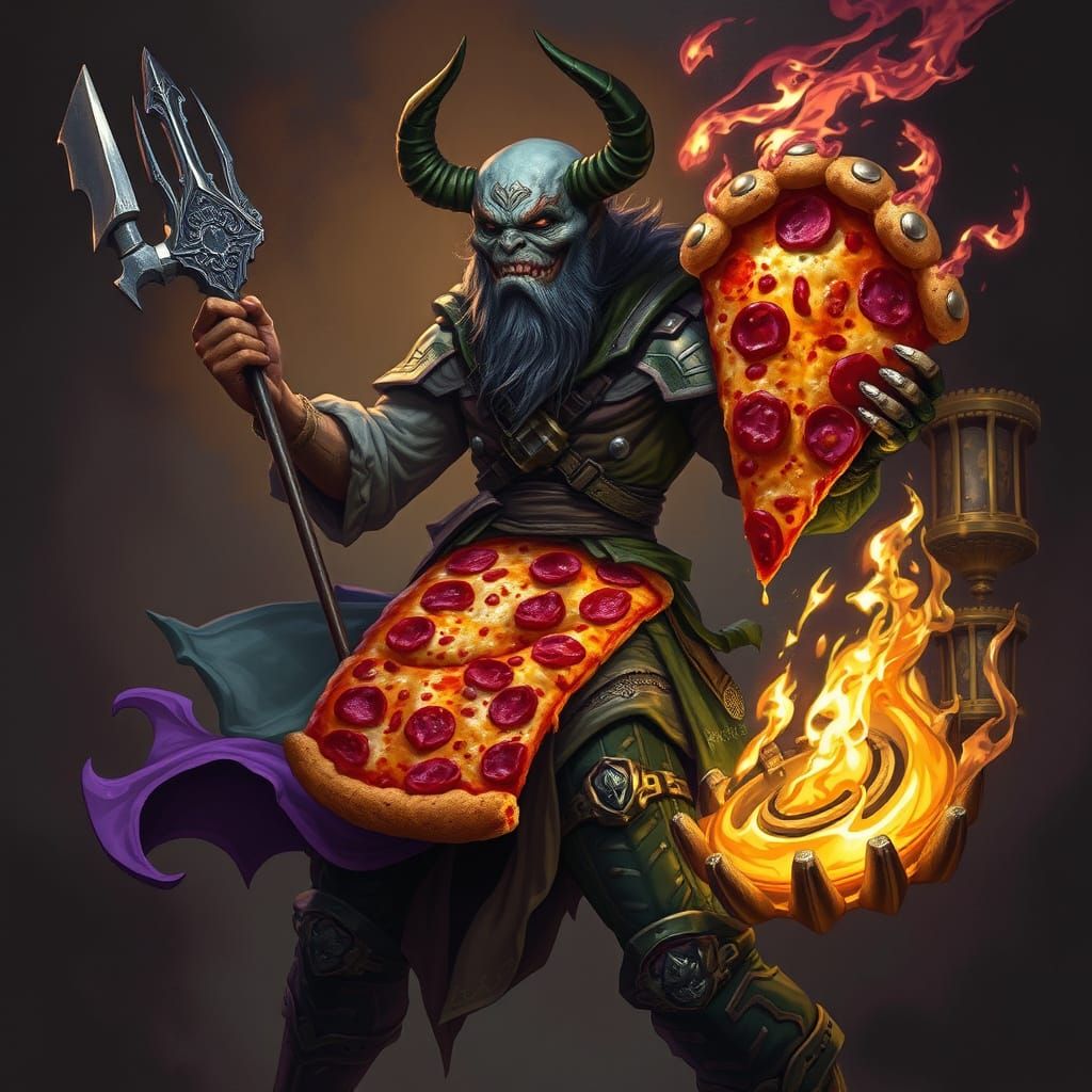 This image shows a fantastic character made entirely of pizza toppings. The artwork features studio lighting, vivid colors, and a neutral background, rendered with hyperrealistic details in a dark fantasy art style.
