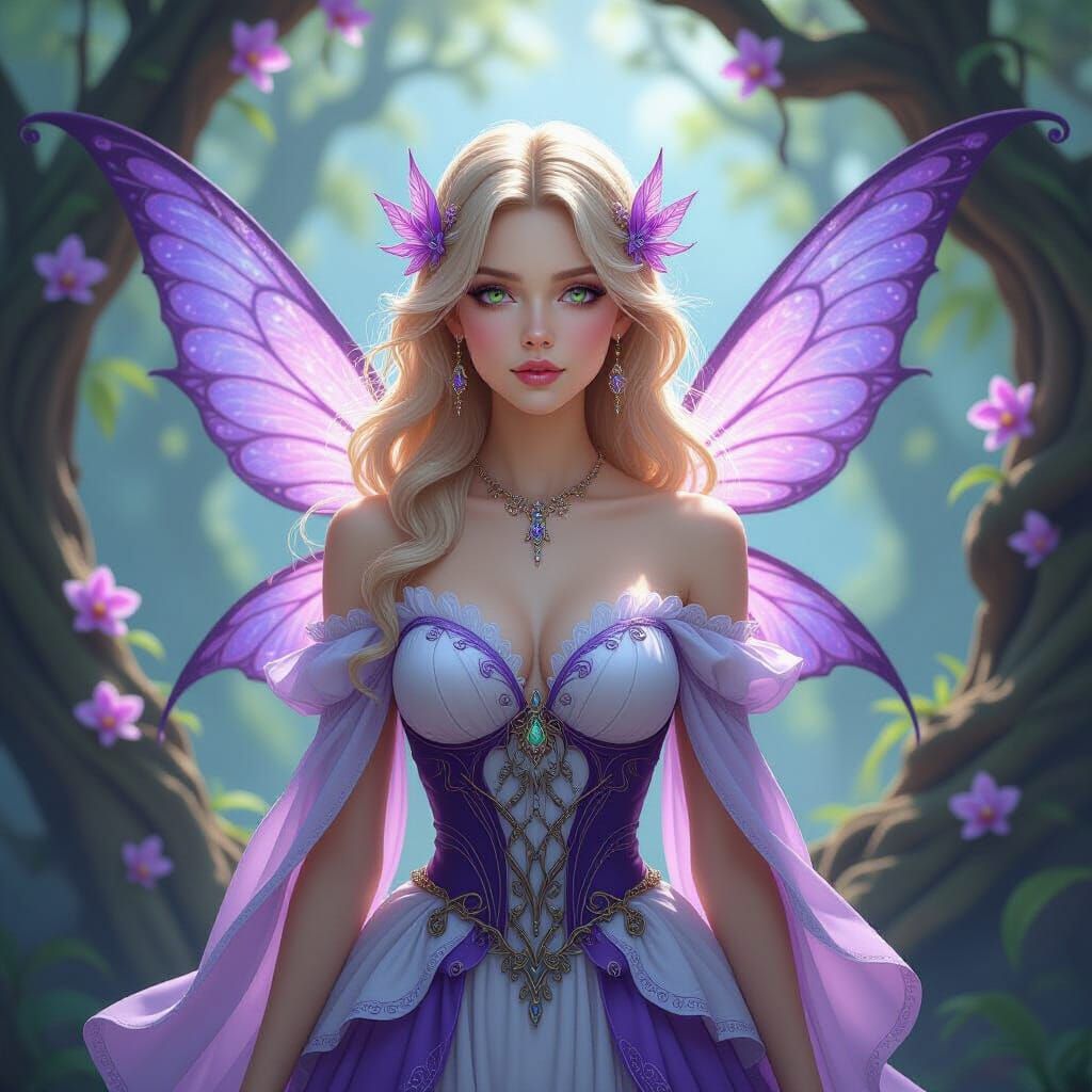 This image showcases a beautiful fairy with blond hair and green eyes, wearing a purple and white dress. She stands among trees with orchids, depicted in detailed concept art with dynamic lighting.