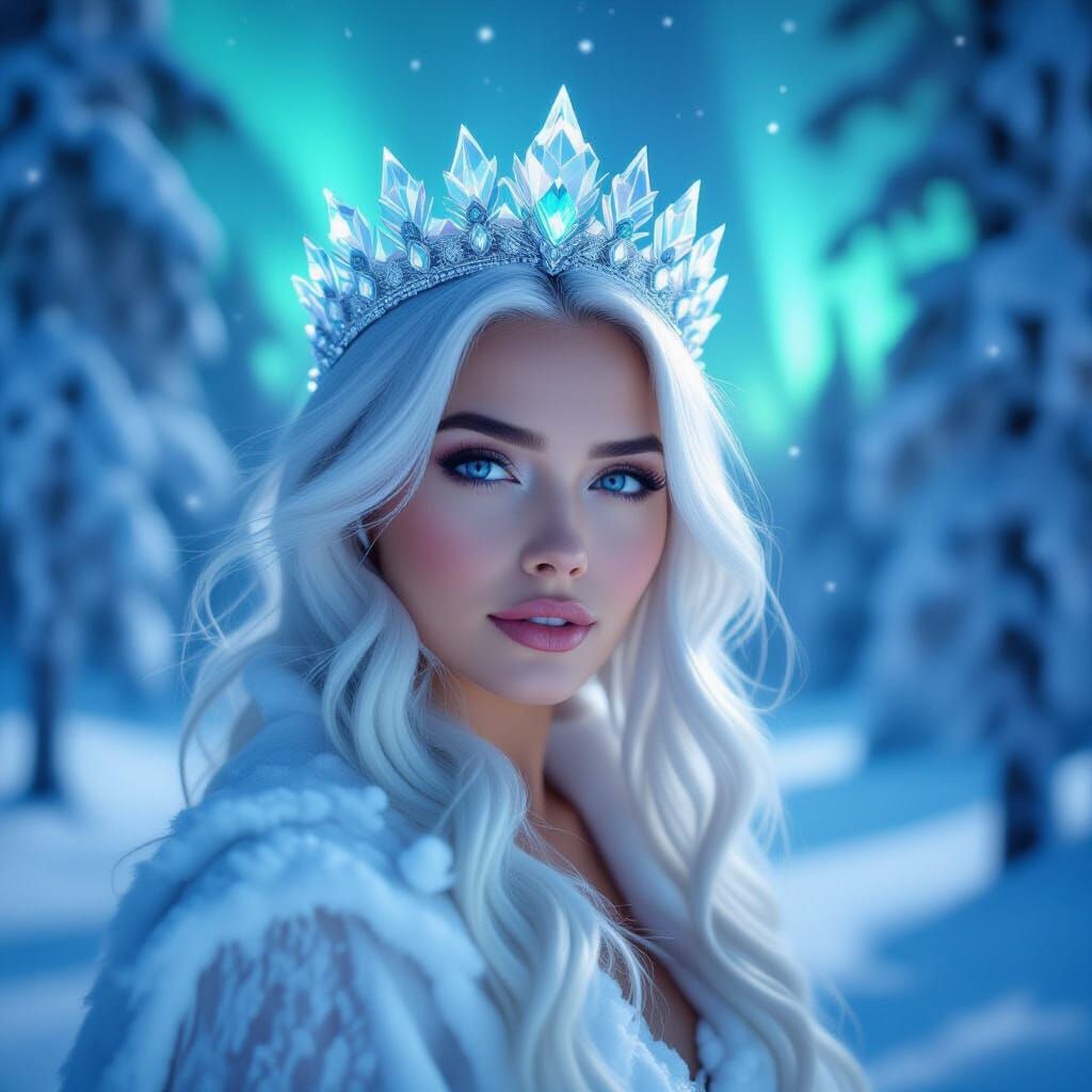 A captivating image of a woman with platinum hair and sapphire eyes in a snow-covered forest. The woman wears an ice crystal crown and is illuminated by soft light reminiscent of a cinematic film still.