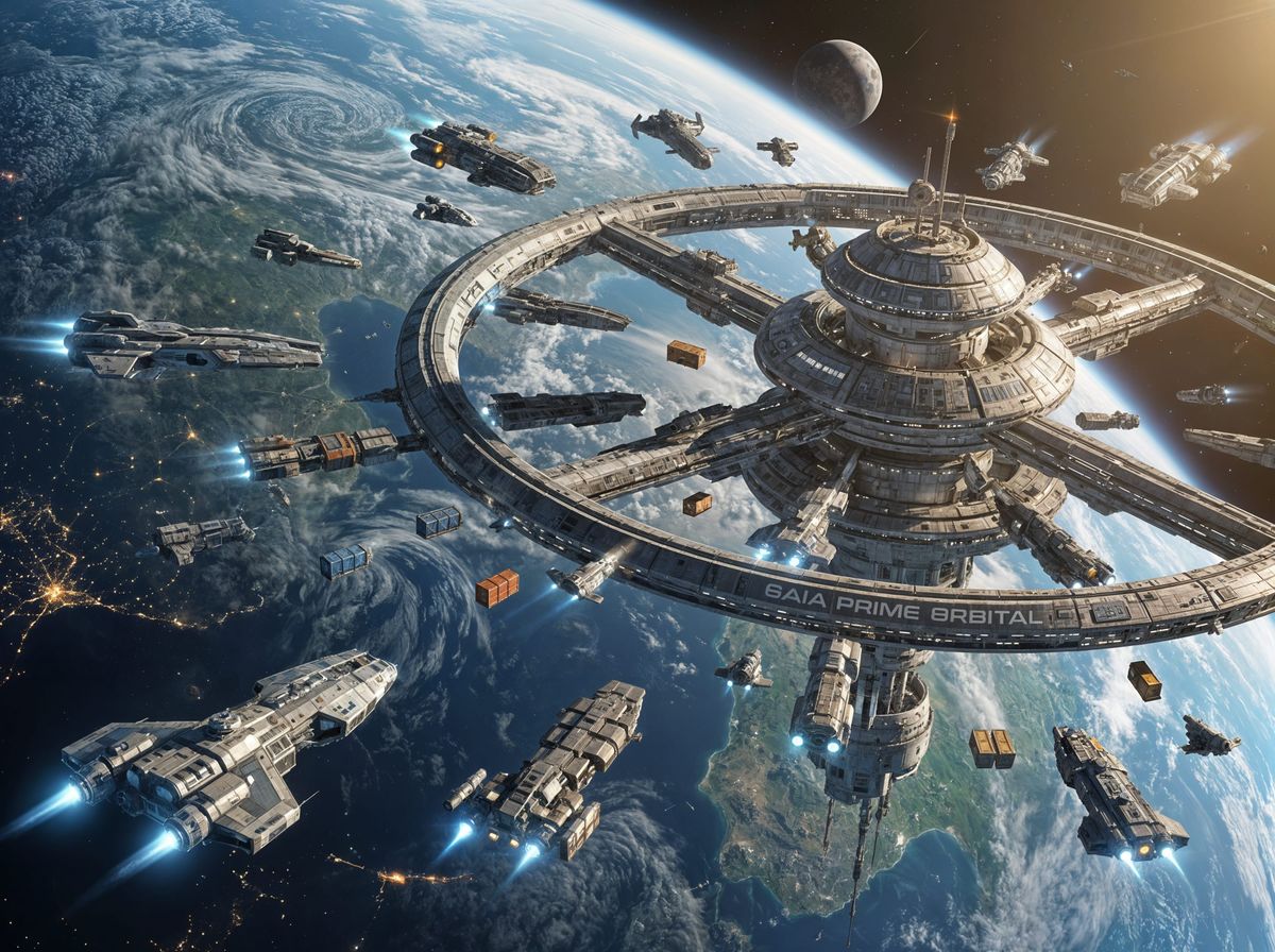 This image depicts a futuristic space station in orbit around a planet, with numerous starships actively docking and undocking, creating a busy cosmic hub.