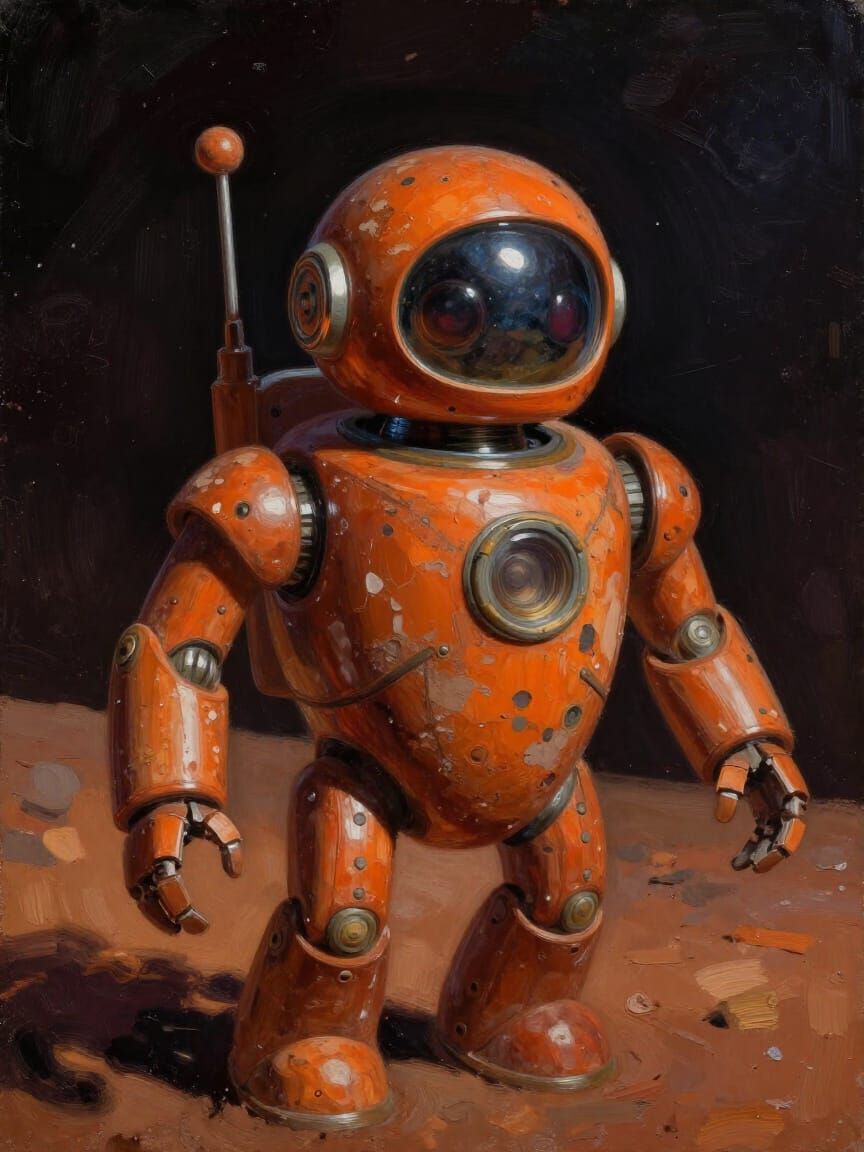 Solar Vintageworks, orange amber rust sandstone clay burnt_umber, Spectrum Studio, Retro-Futurism shiny round robot floating in space, orbiting Mars, impasto-rich image with heavy brushstrokes and deep shadows, ominous lighting, deep shadows, deep focus,