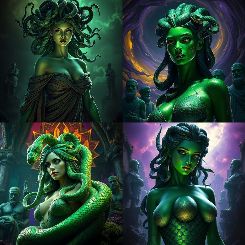 This image depicts a mesmerizing green goddess with iridescent scales, surrounded by intricate details and dramatic lighting in a dark fantasy environment.