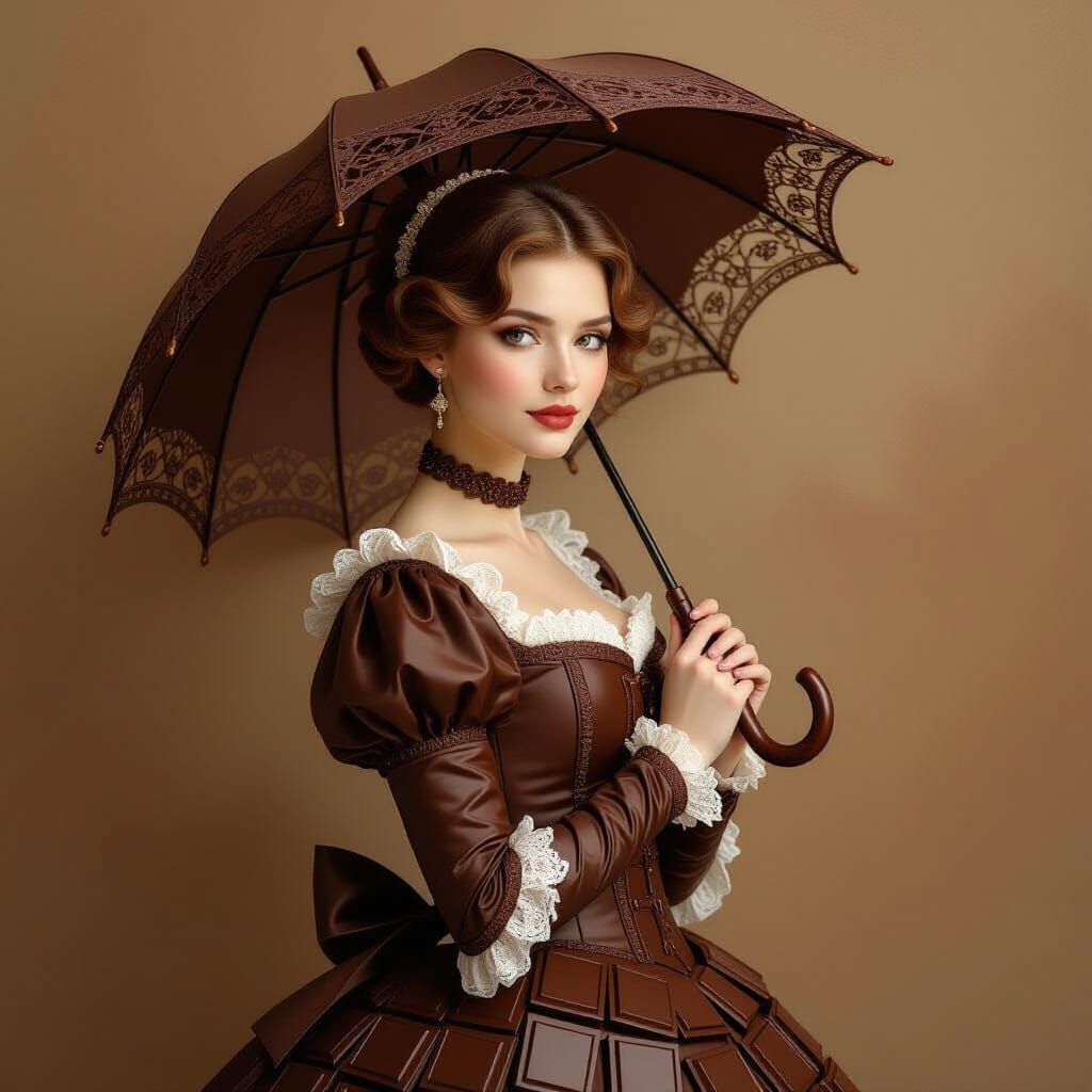 This image shows a woman in a chocolate dress holding a chocolate umbrella. The artwork evokes Romanticism with fine details and an ethereal environment, akin to digital painting.